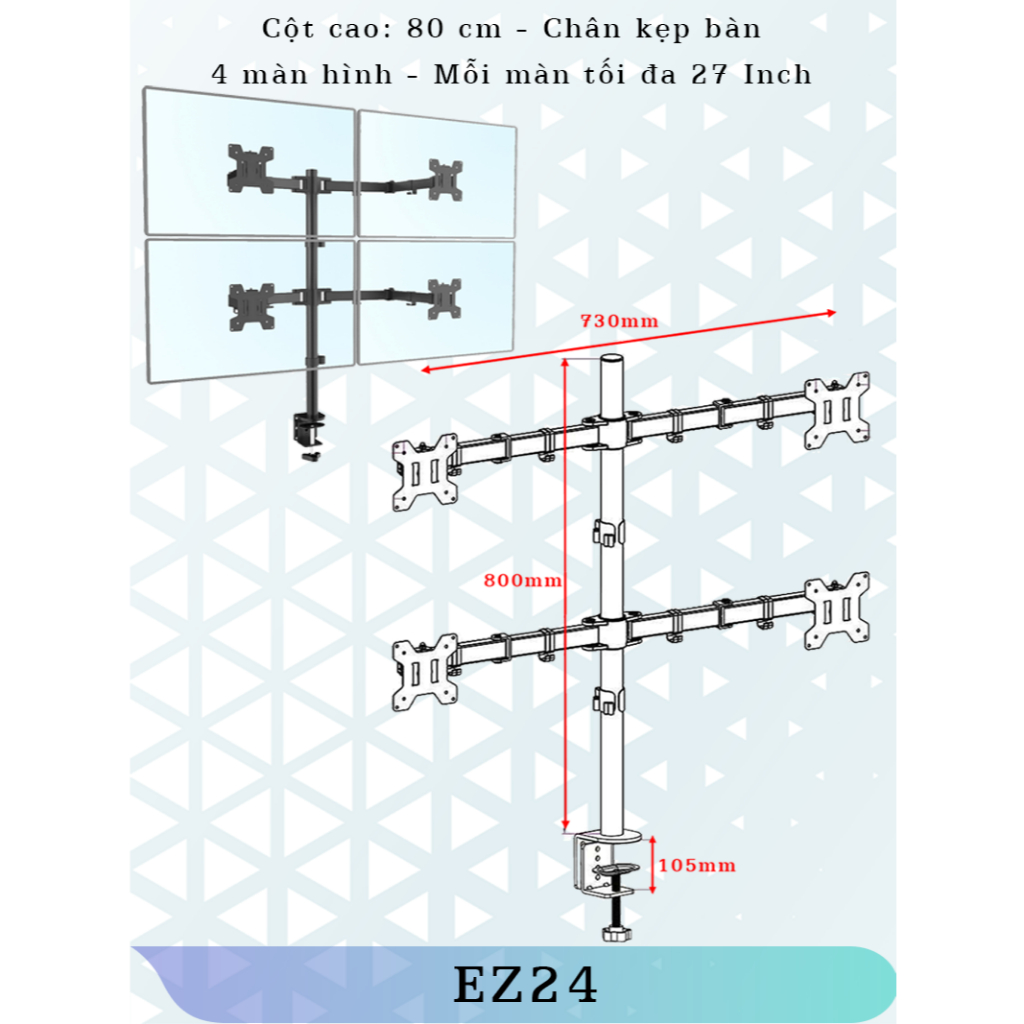 - Cột đứng cao 80cm, dễ dàng điều chỉnh độ cao thấp của hai màn hình