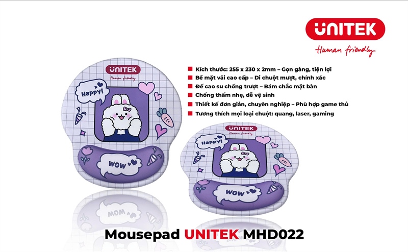 - Thiết kế: Hình oval kèm đệm kê tay, họa tiết thỏ trắng siêu dễ thương