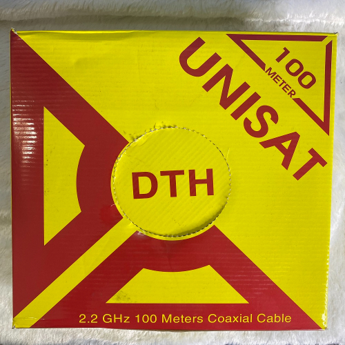 Cáp đồng trục UNISAT RG6 100m được đóng gói sẳn hộp, trong mỗi hộp có tặng kèm 4 bộ Jack F Đực inok và 4 con F